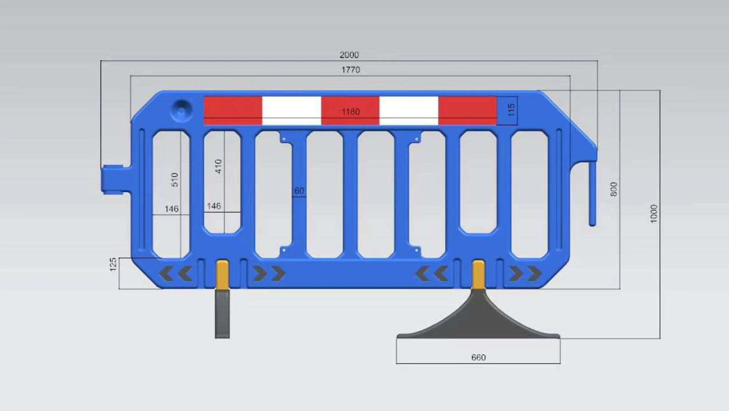 Diese Barrieren sind blasgeformt .Das bedeutet, dass sie als heiße, hohle thermoplastische Vorform innerhalb einer geschlossenen Form aufgeblasen werden. Dadurch nimmt die aufgeblasene Form die Gestalt des Formhohlraums an. Dies gewährleistet Konsistenz, sodass jede Kunststoffbarriere exakt nach denselben Spezifikationen hergestellt wird, und verringert das Risiko von Qualitätsproblemen