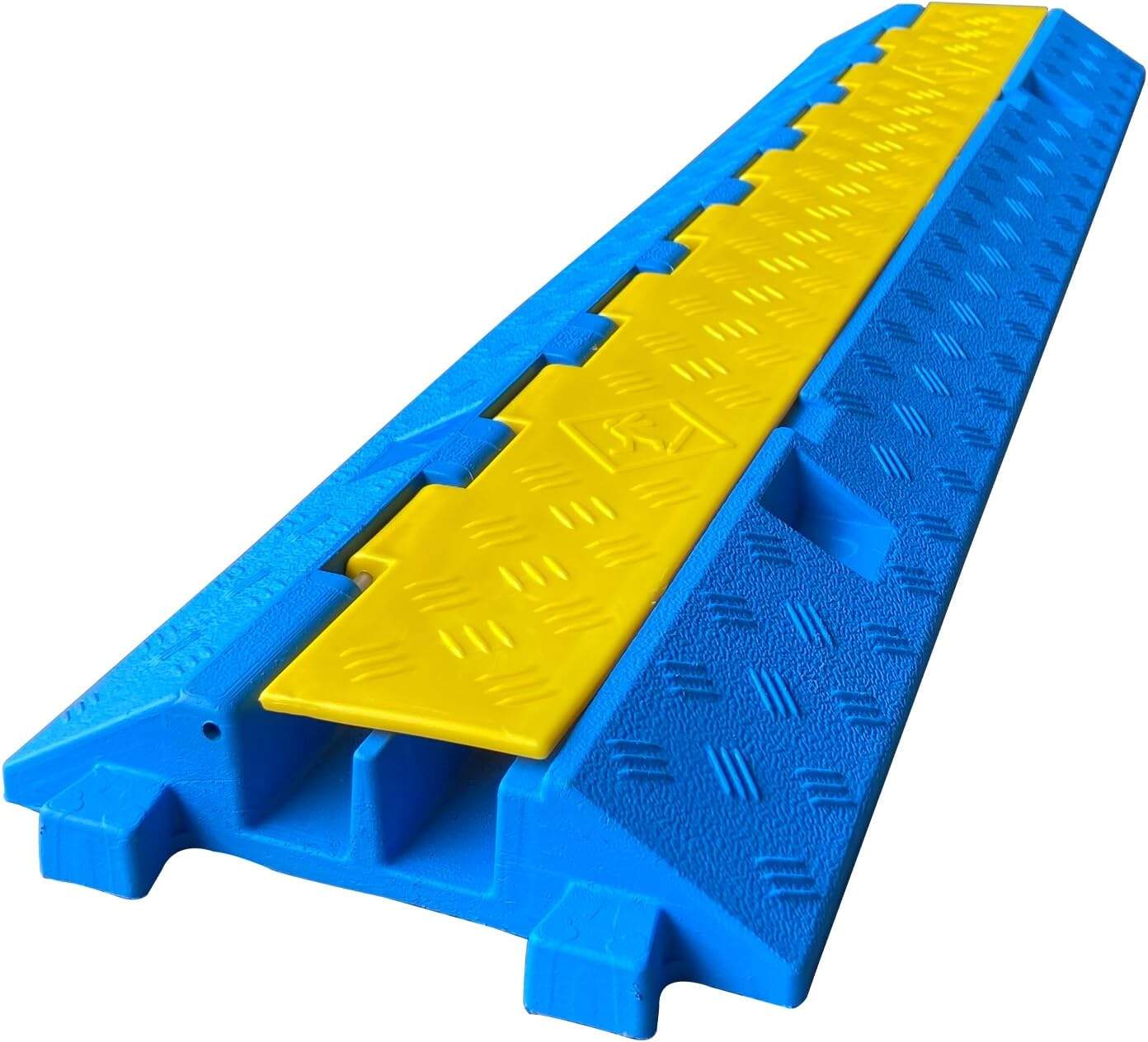 This heavy-duty 5-channel rubber cable protector ramp is specially engineered for industrial workplaces, warehouse forklift lanes, power and lighting cable layouts, construction sites, and outdoor events. The base is molded from high-density rubber, providing strong load-bearing performance suitable for vehicles up to 22,000 lbs. The yellow flip-top cover allows quick wire deployment while ensuring visibility and safety