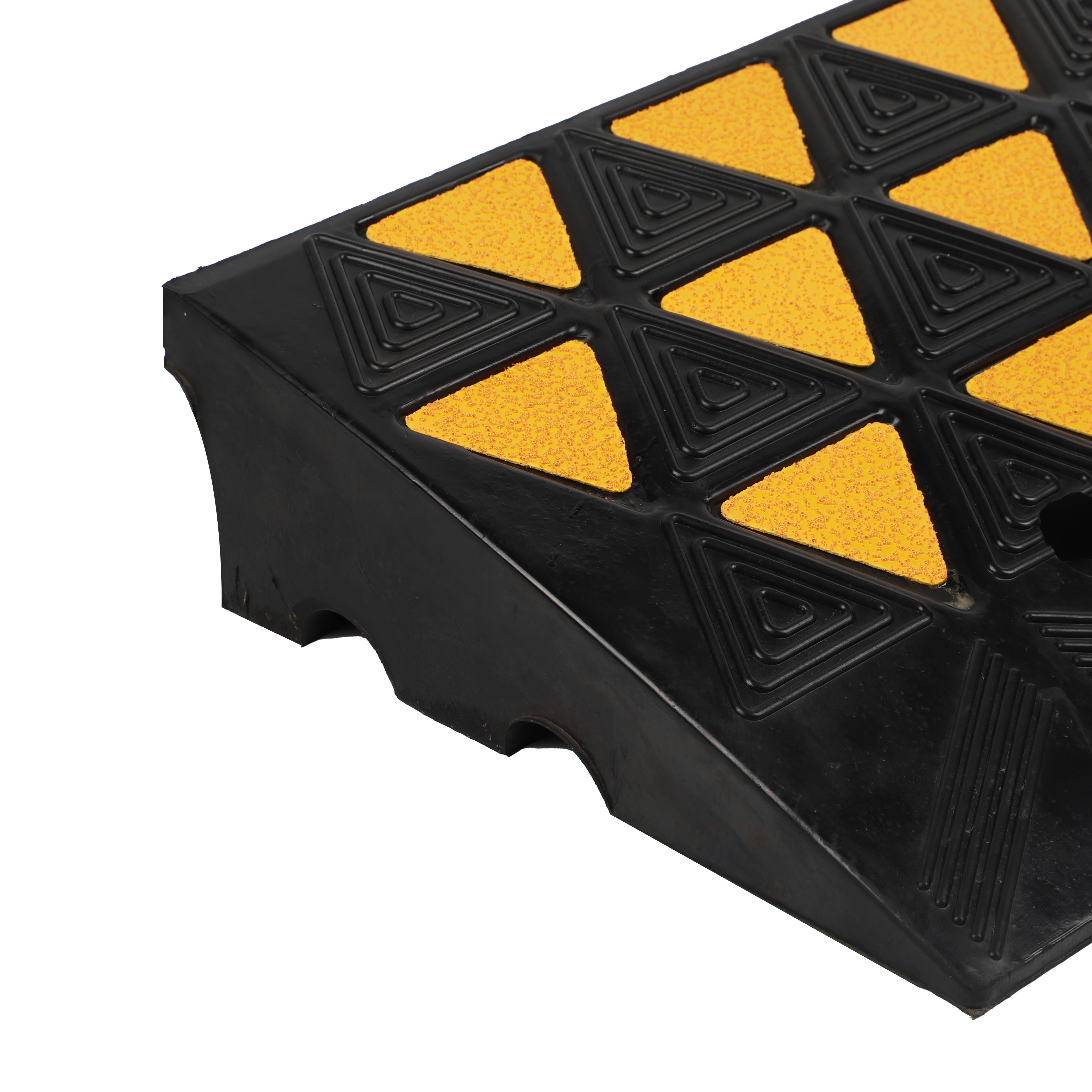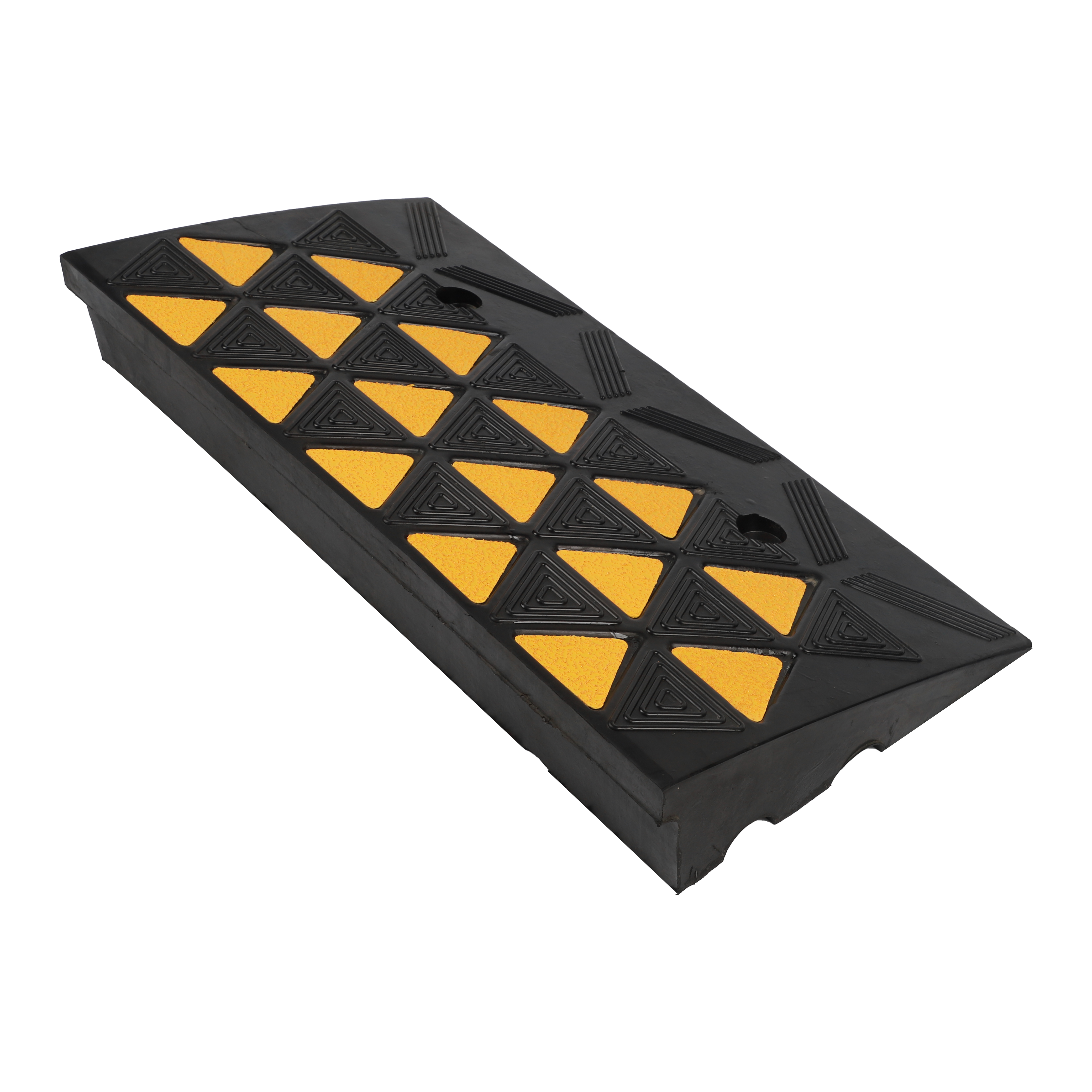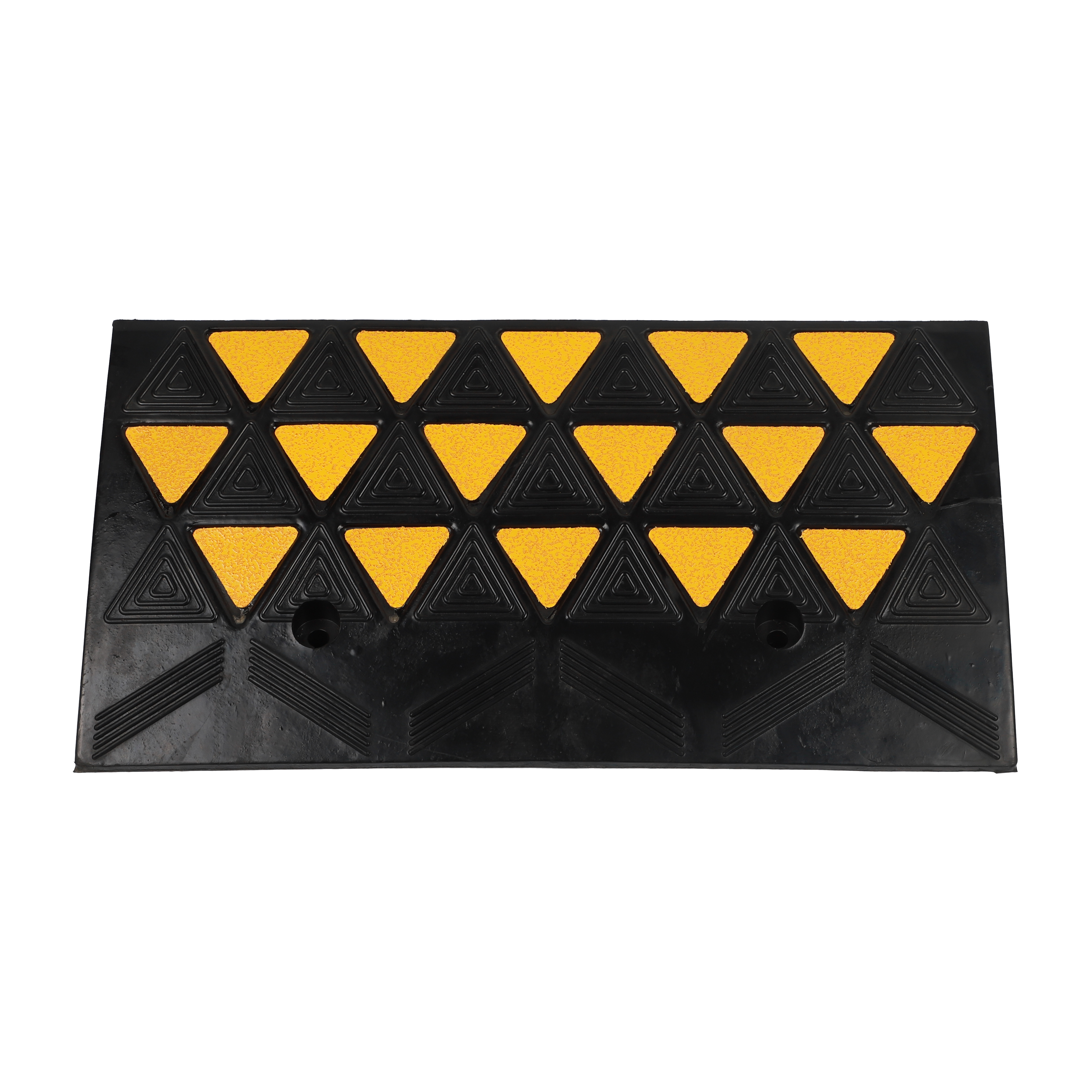 3. Veelzijdige toepassing en hoge zichtbaarheid Specifiek ontworpen om hoogteverschillen van 10 cm te overbruggen, is deze helling ideaal voor industriële magazijnen, laadperrons, commerciële opritten en trottoirkanten het biedt een soepele toegang voor voertuigen, variërend van auto's en SUV's tot handwagens en heftrucks. De ingebedde geel reflecterende driehoeken met hoge intensiteit zorgen voor uitstekende zichtbaarheid voor bestuurders tijdens de nacht of in binnenruimtes met weinig licht.