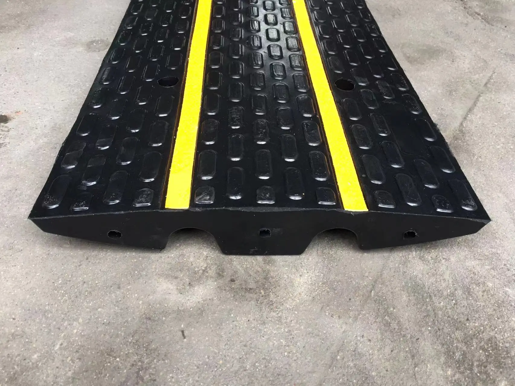 Egenskaper: 1. Holdbar enfelts fast gummiterskel rampe som ikke sklir i verken innendørs eller utendørs forhold. 2. Slitelast friksjonsgjort gummiplate med støpte dreneringskanaler for bedre grep. 3. Skråkantede sider gir en jevn overgang fra alle sider. 4. Passer de fleste tersler og er enkel å modifisere ved behov. 5. Ingen montering nødvendig