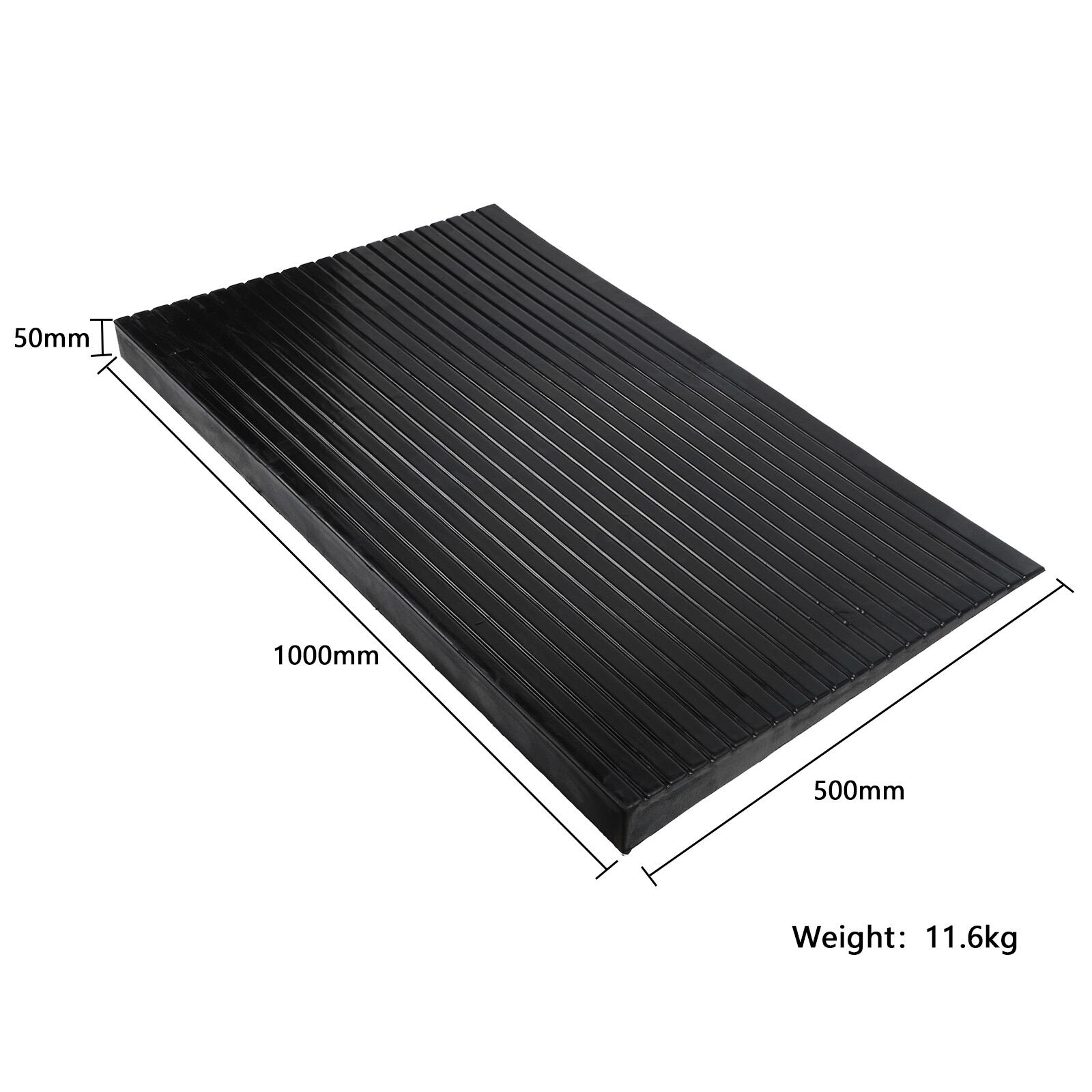 Especificações Robustas para Estabilidade: Cada unidade mede 1000 x 500 x 50 mm e pesa 11,6 kg a altura de 50 mm (2 polegadas) foi projetada especificamente para vencer soleiras comerciais comuns e guias baixas, enquanto seu peso considerável proporciona excelente estabilidade natural, garantindo que a rampa permaneça firmemente posicionada mesmo sob alta pressão dos pneus.